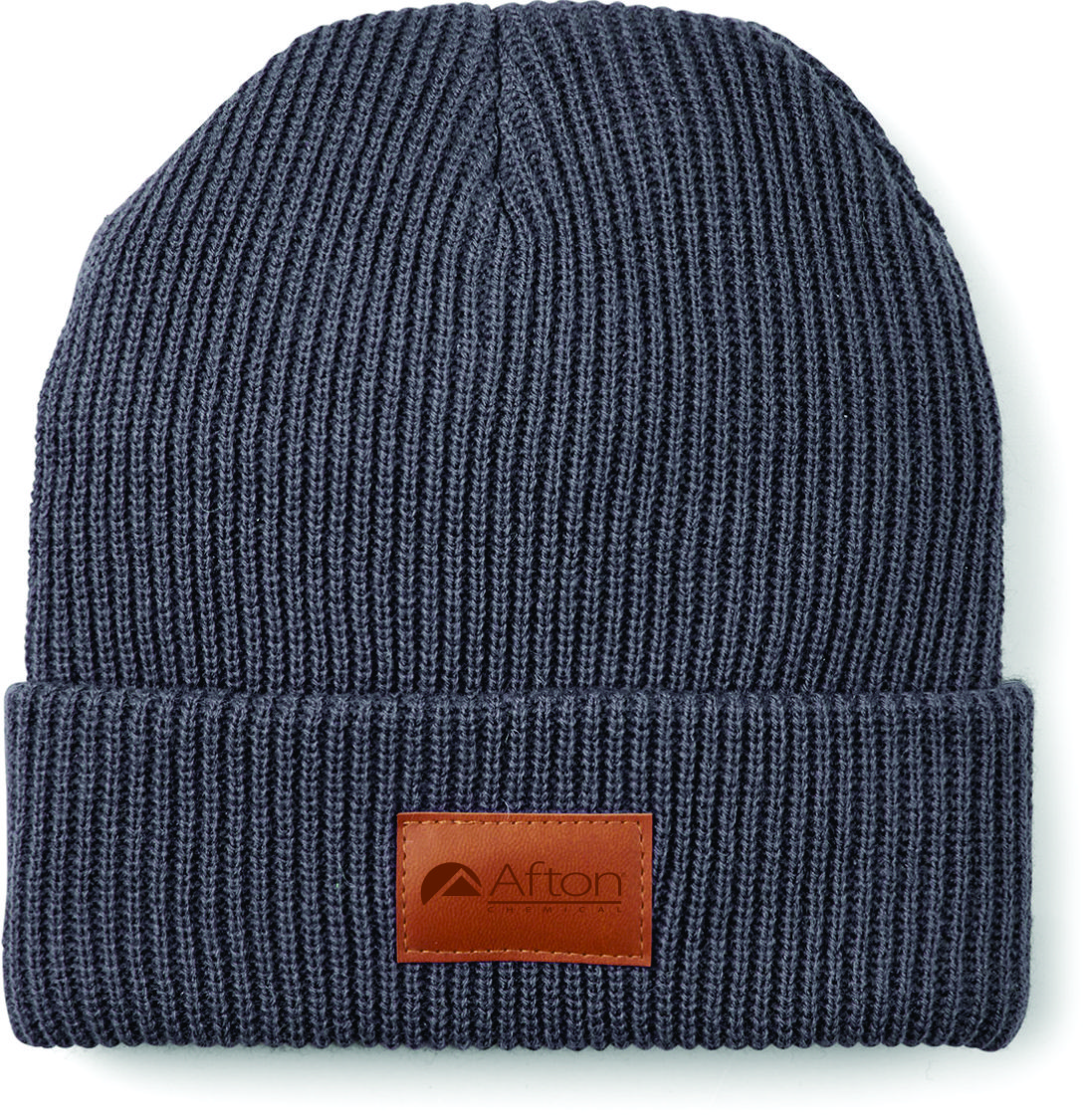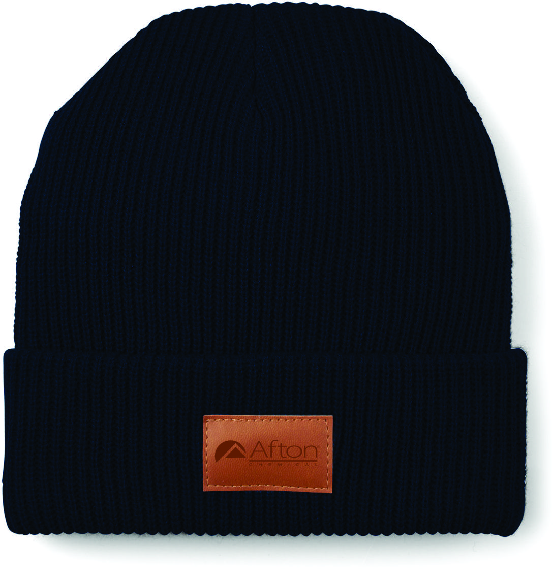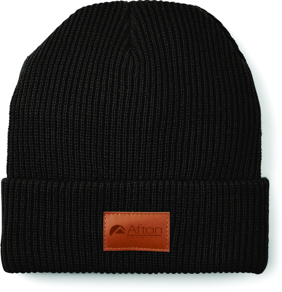 100% Acrylic rib knit beanie with PU faux leather patch on front cuff.